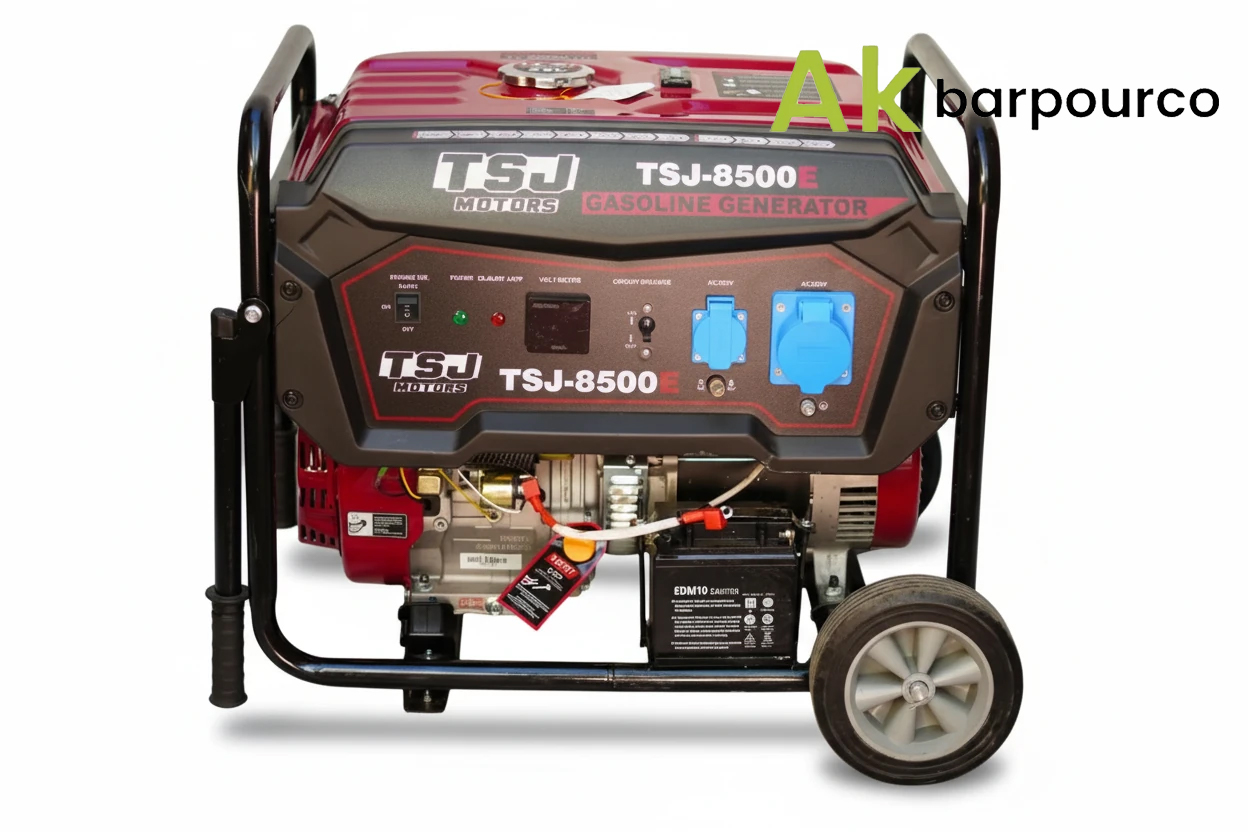 موتور برق بنزینی TSJ‑8500E با توان واقعی ۵ کیلووات، مجهز به استارت الکتریکی و هندلی، سیمپیچ ۱۰۰٪ مس، خروجی شهری و صنعتی و سنسور روغن؛ گزینهای قدرتمند و مطمئن برای مصارف خانگی، کارگاهی و ساختمانی.